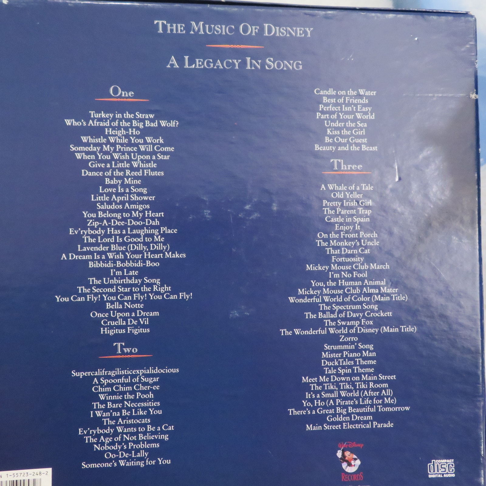 The Music of Disney: A Legacy in Song 3 CD box set. Celebrate Disney's rich musical history from 1928 to 1991. Includes three audio CD's featuring iconic songs from classics like Snow White, Cinderella, The Jungle Book, The Little Mermaid and much more. Original box with booklet.